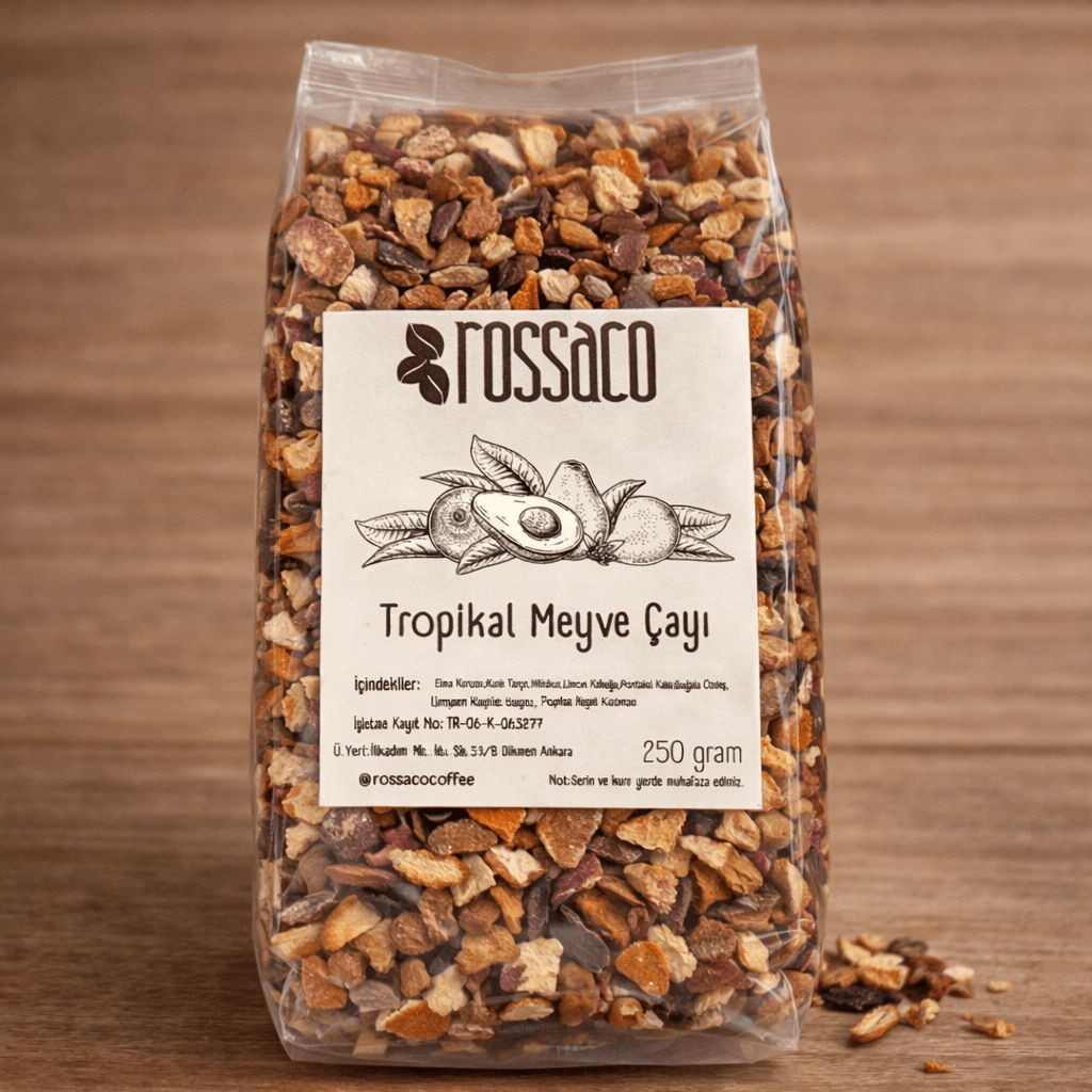 Rossaco Tropikal Meyve Çayı, elma, turunç kabukları ve tropikal meyve parçalarının özenle harmanlanmasıyla hazırlanmış aromatik bir meyve çayıdır. Canlı aromasıyla sıcak veya soğuk olarak keyifle tüketilebilir.
