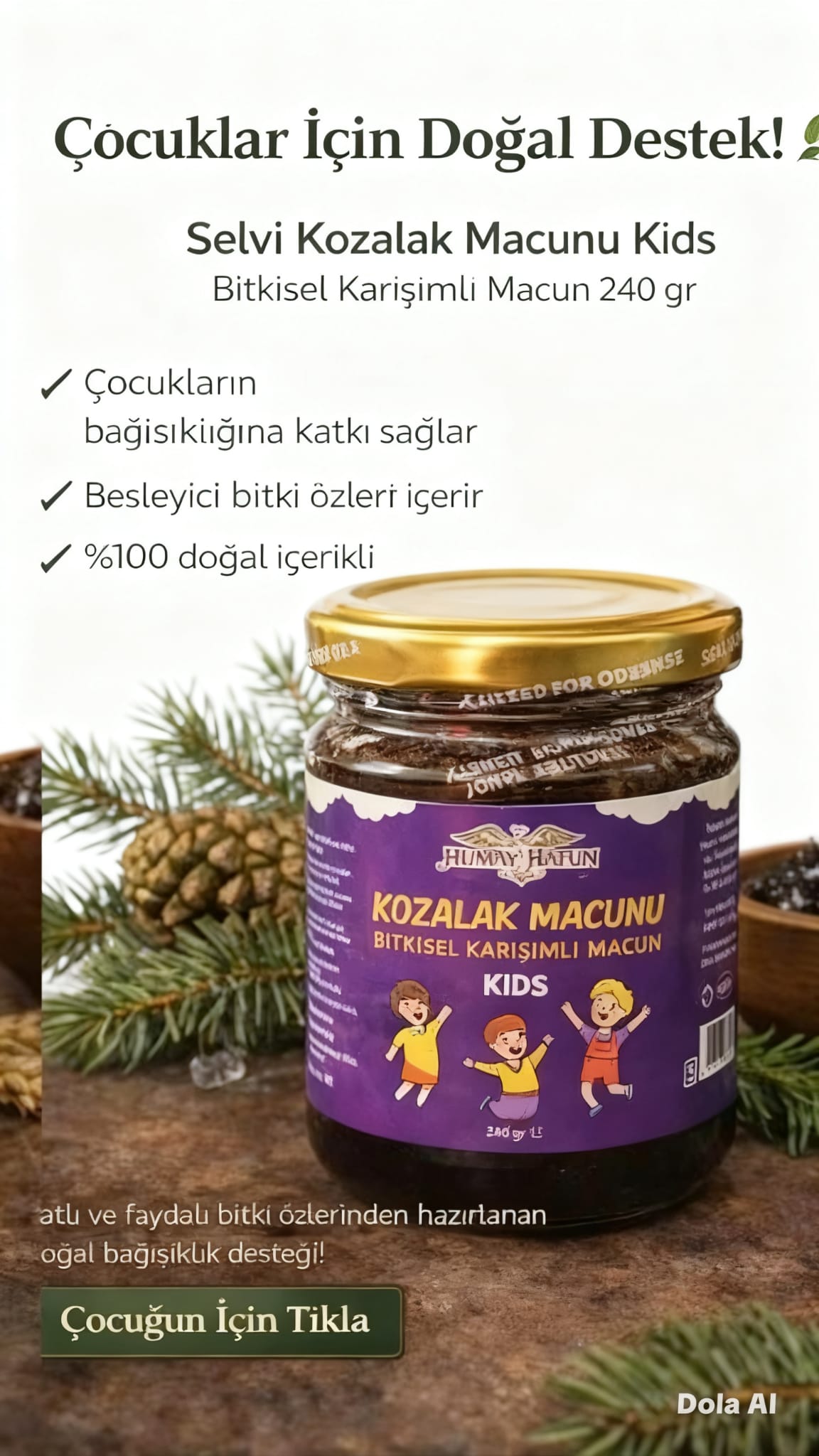 Humay Hatun Selvi Kozalak Macunu Kids, çocuklara özel olarak hazırlanan bitkisel karışımlı bir macundur. Selvi kozalakları ve doğal bileşenlerin özenle harmanlanmasıyla üretilmiştir. Cam kavanozda muhafaza edilerek ürünün doğallığı korunur.